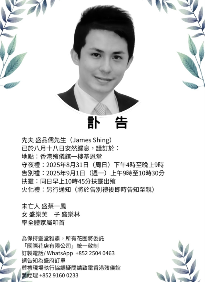 根据蔡一凤8月21日发布的讣告,盛品儒守夜礼时间为8月31日下午4时至晚上9时,告别礼是9月1日上午9时至10时30分,同日10时45分扶灵出殡,火化时间则在告别礼后告知至亲。