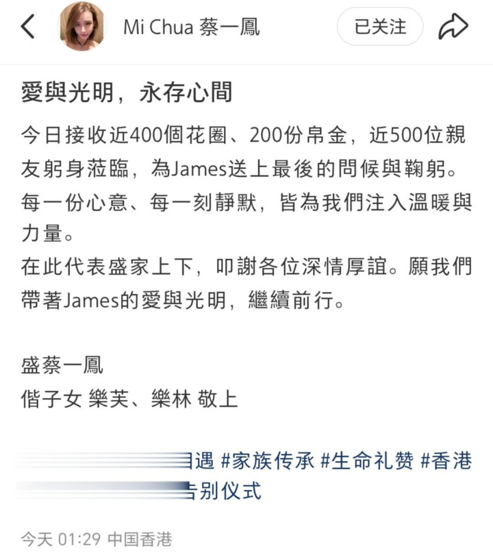 今天(9月1日)凌晨1点多,蔡一凤悲痛发文称,接收近400个花圈、200份帛金,近500位亲友躬身莅临,为James送上最后的问候与鞠躬。每一份心意、每一刻静默,皆为我们注入温暖与力量。